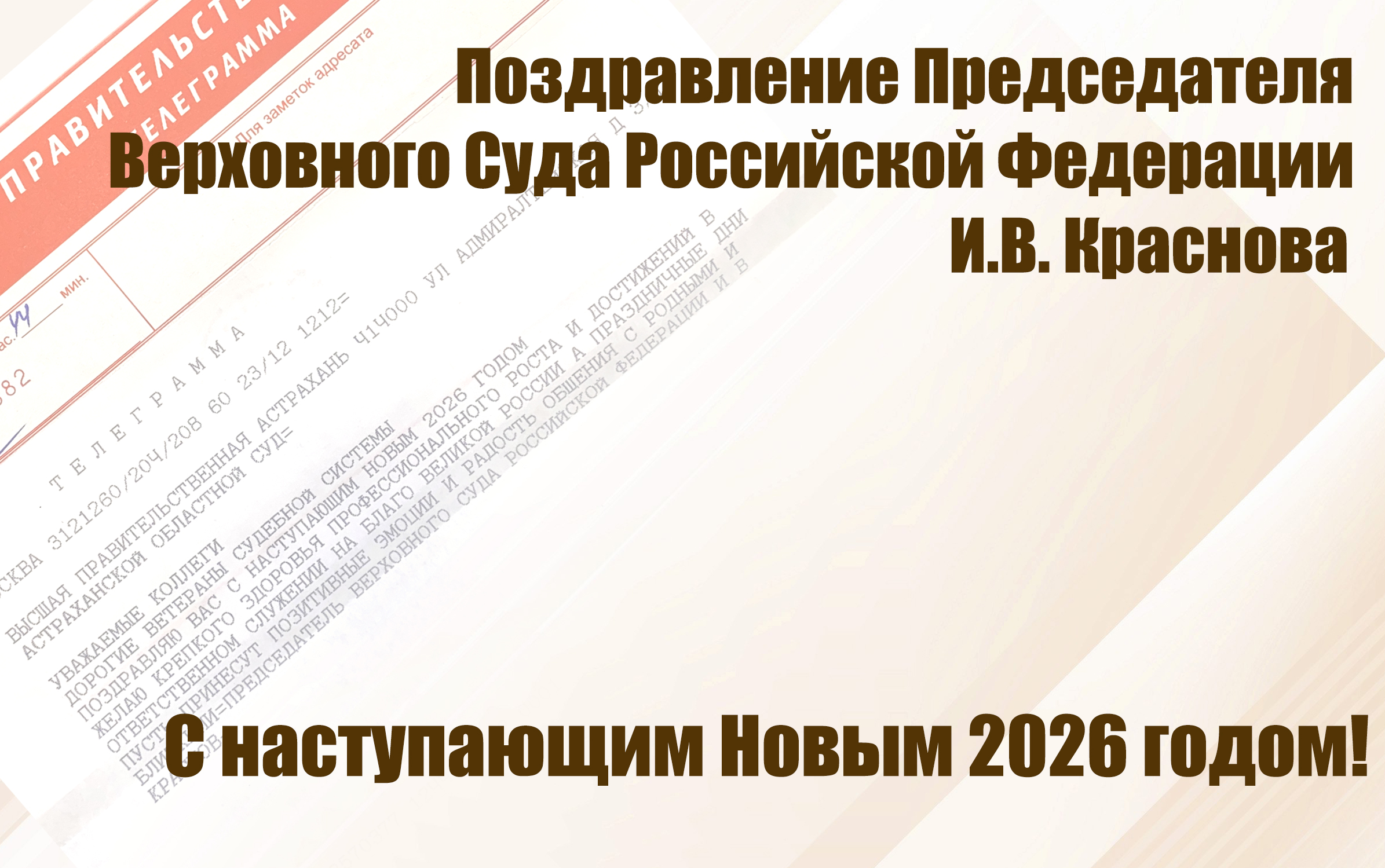 Астраханский областной суд получил поздравительную телеграмму от Председателя Верховного Суда Российской Федерации И.В. Краснова с теплыми поздравлениями с новогодними праздниками. Игорь Викторович поздравил коллег и ветеранов судебной системы с наступающим Новым 2026 годом, пожелав крепкого здоровья, профессионального роста и достижений в ответственном служении на благо нашей Родины. |